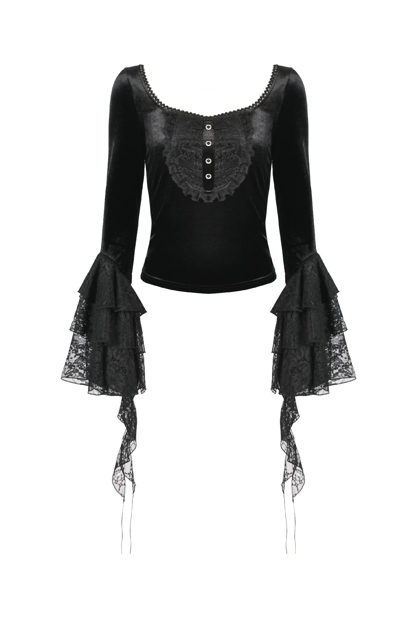 Deze gotische hofstijl blouse met vierkante hals heeft een nauwsluitende silhouet gemaakt van een mix van kant en fluweel, waarbij elegantie met comfort wordt gecombineerd. De halslijn is versierd met elastische, gebogen kanten randen, wat het sierlijke uiterlijk versterkt en de schouders en nek prachtig omlijst. De voorkant toont een U-vormig kantgeplooid ontwerp, omlijnd met gerimpelde kanten ruches en geaccentueerd door een nep knip met decoratieve knopen.