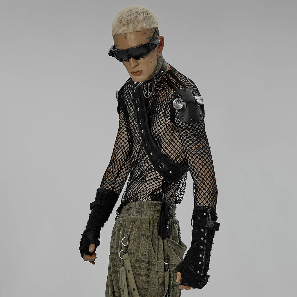 Functionele riem in polyester met abstract jacquardweefsel, voorzien van verstelbare pasvorm en één universele maat. Uitgerust met afneembare utiliteitszak en prominente metalen oogjes die zowel structuur als visuele impact bieden. Een praktisch accessoire met statement-potentieel voor alternatieve styling.