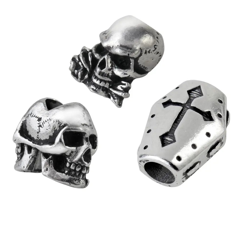 Productbeschrijving: Een tinnen, dubbele schedel baard- en/of haarparel, geregen met behulp van een haarparel-inrijggereedschap.