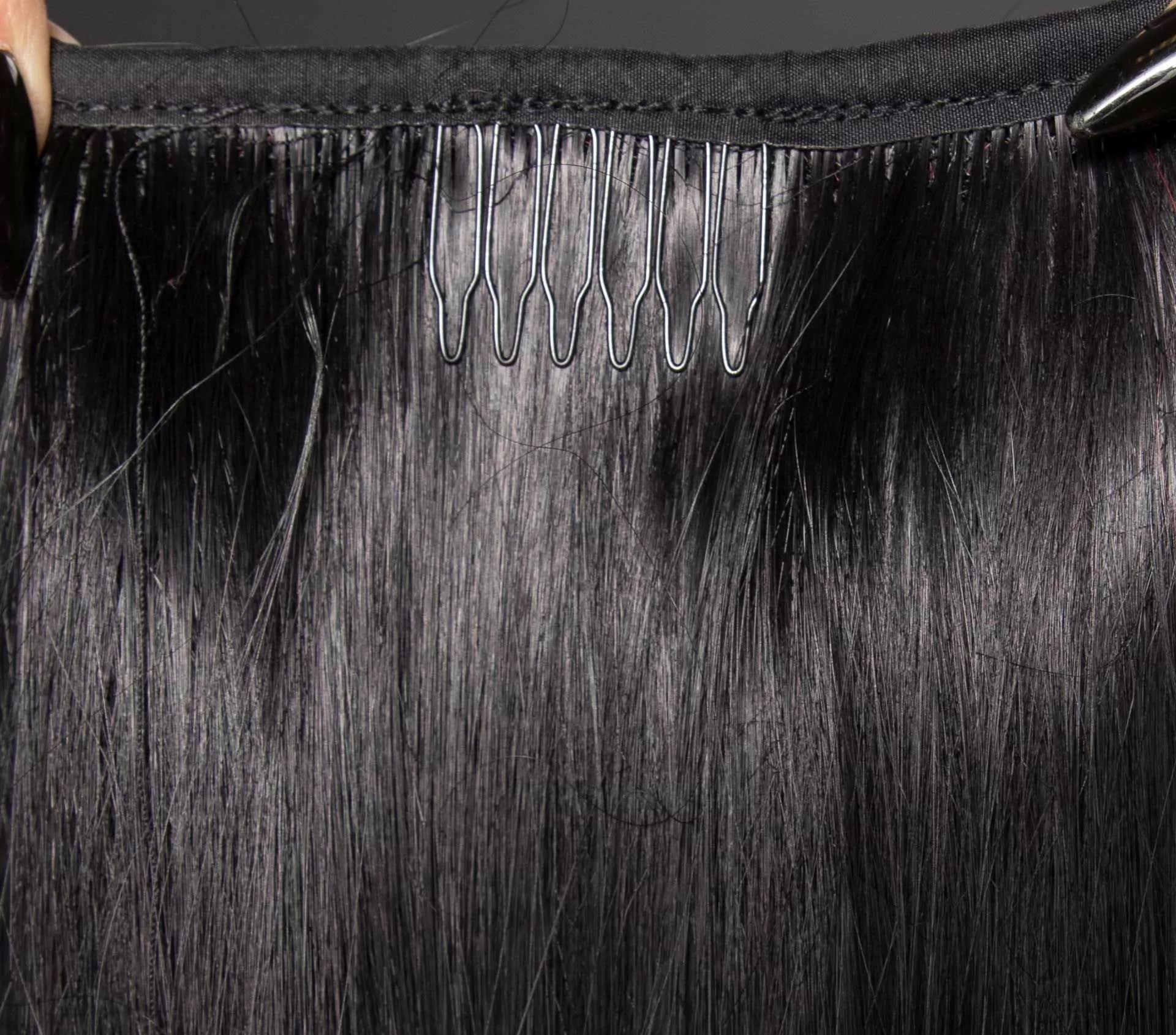 - Schuif de kam die aan het haarstuk vastzit tussen je haar en het elastiekje door.