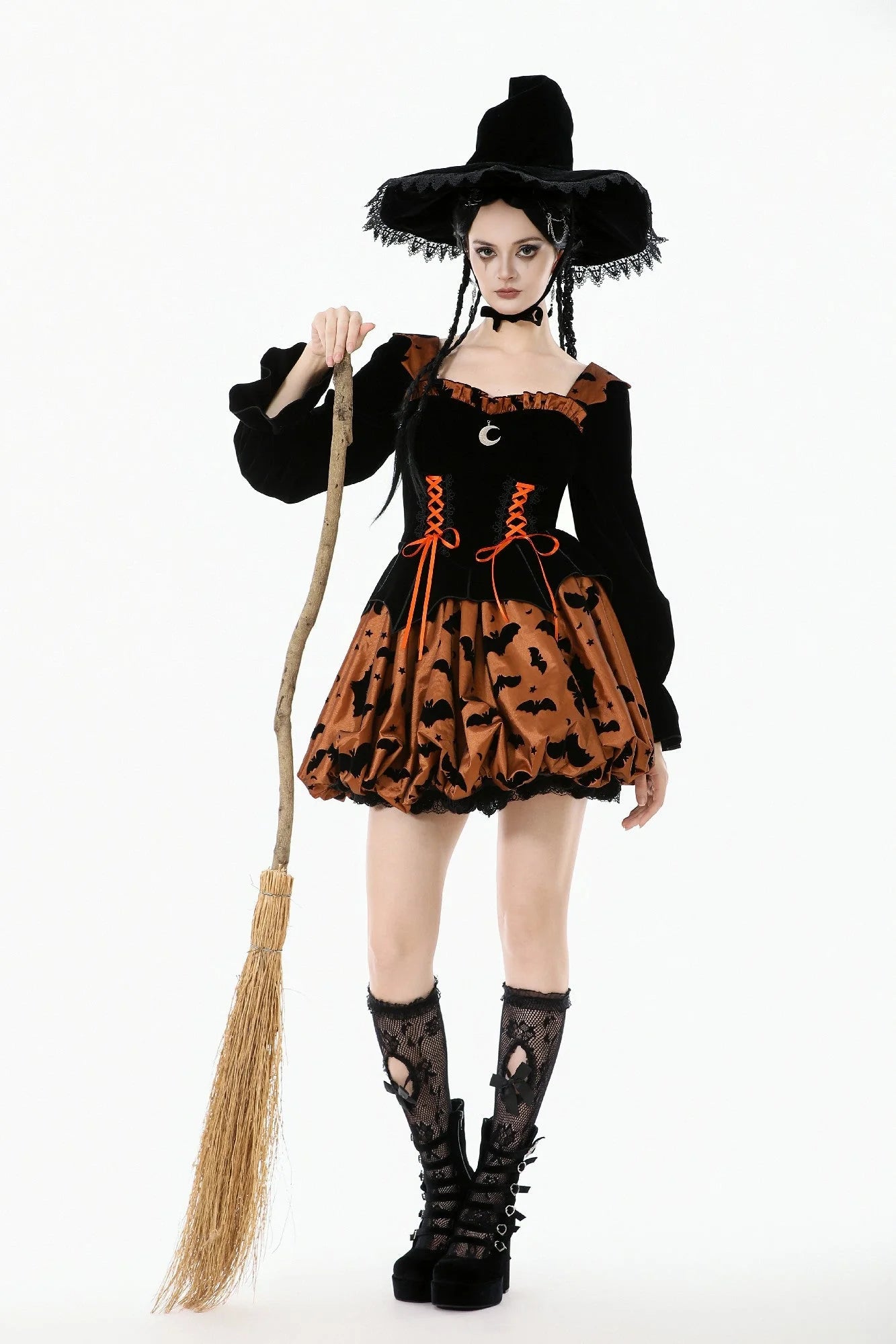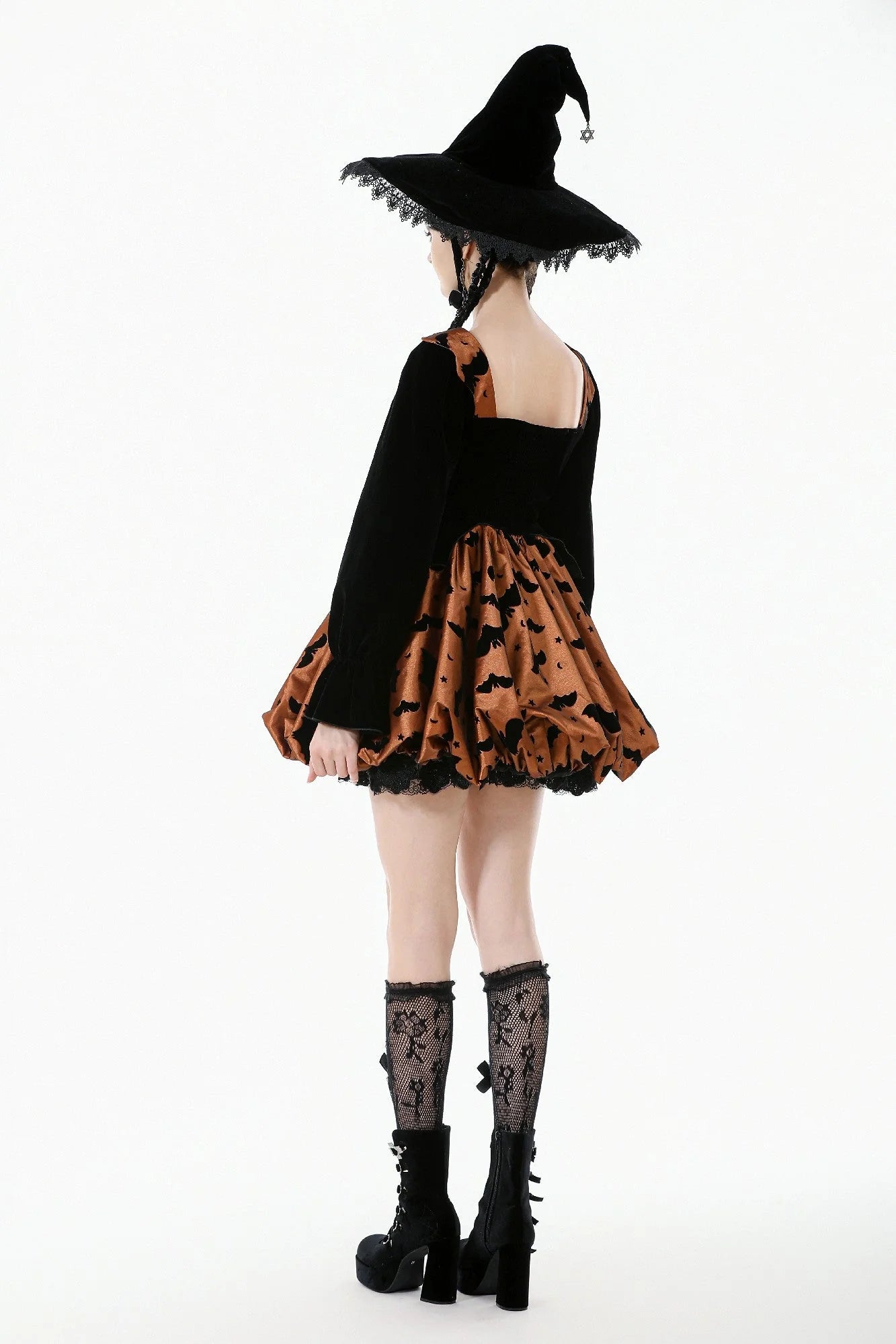De vleermuis-achtige zoom en de door een pompje-o'-lantaarn geïnspireerde bubble skirt geven een feestelijke twist, terwijl het geplooide lijfje, de ruches en het zilveren maanornament op de borst de aandacht trekken met hun verfijnde details. Puffmouwen en verstelbare zijstrikjes zorgen voor comfort en silhouet, waardoor deze jurk net zo flatterend als leuk is.