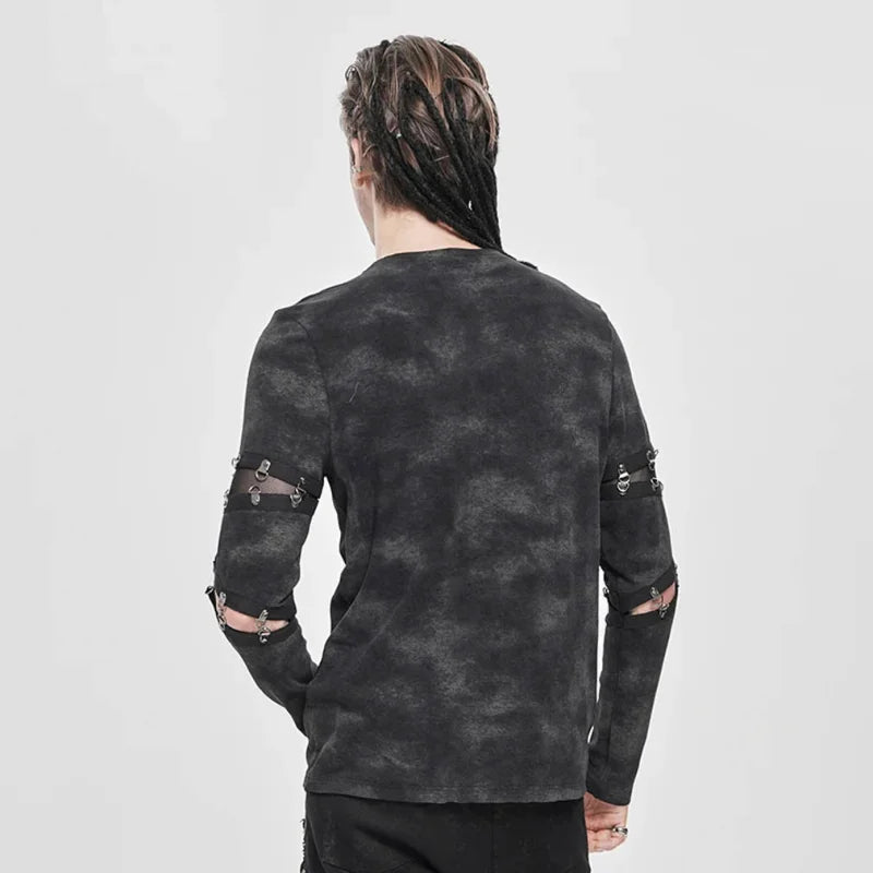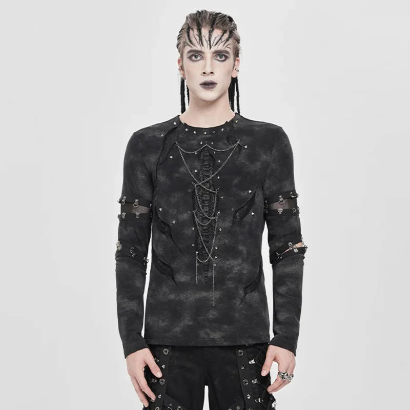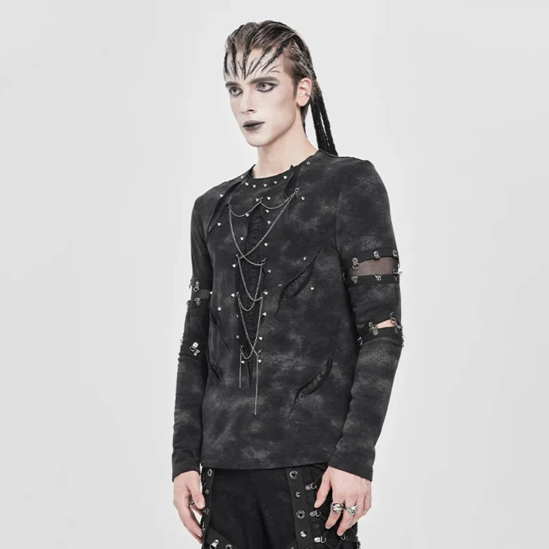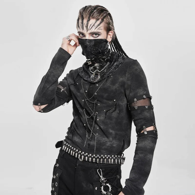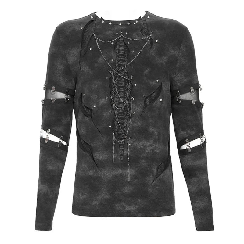 Een donkere blikvanger met dystopische flair: het "Ripped Apart"-shirt combineert een eindtijd-esthetiek met een verfijnde gelaagde look. Gerepleide details, mesh-inserts en zilverkleurige kettingapplicaties maken dit shirt met lange mouwen de perfecte keuze voor cyberpunk-evenementen, industriële feesten of rebelse streetwear-statements.