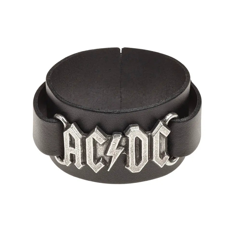 Productbeschrijving: Een 1 ½" (38 mm) brede zwarte leren polsband met een gegoten antiek Engelse tinnen schakelplaat van AC/DC's klassieke logo uit 1977; verstelbare lengte, vastgemaakt met een stalen gesp.