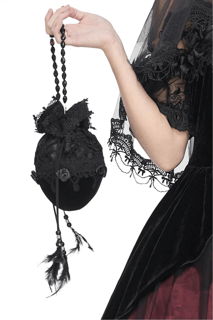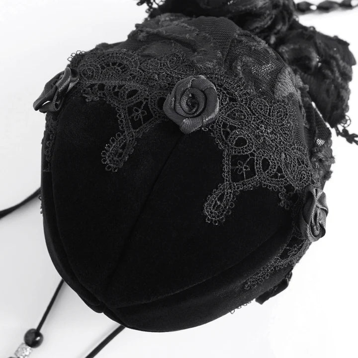Romantische zwarte fluwelen tas in dradenkruisstijl met kanten details en stoffen rozen
