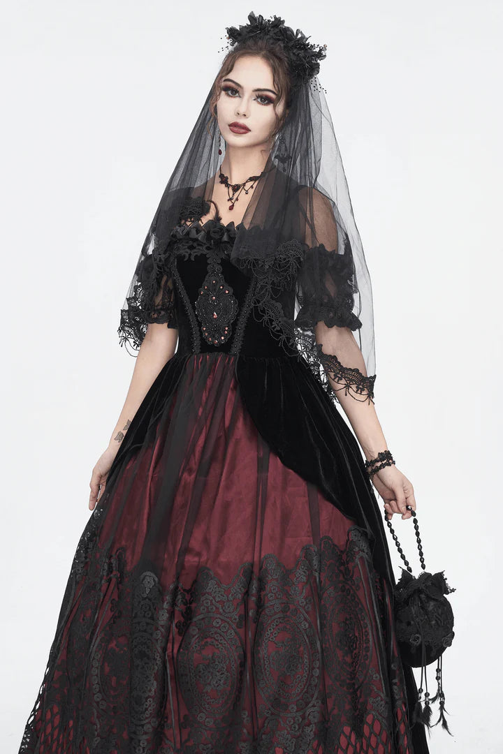- Zwarte kanten details en bies: Delicate kanten details en bies versterken de gotische allure en voegen een vleugje ingewikkeld vakmanschap toe.
