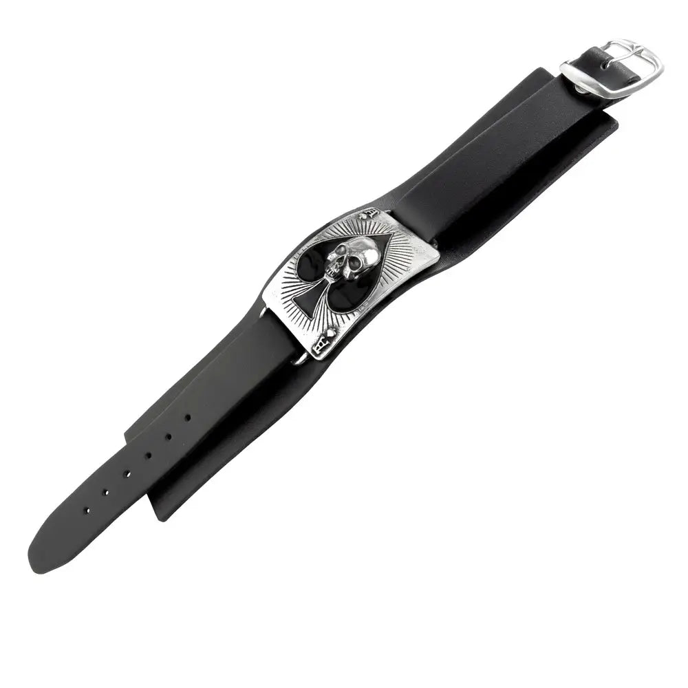 Productbeschrijving: Een grote tinnen en zwart geëmailleerde 'Schoppenaas' kaart, met verhoogd gebeeldhouwd doodshoofd, op een Italiaans gemaakte, 1 ½" zwarte leren polsband. Met verstelbare riem en gesp.