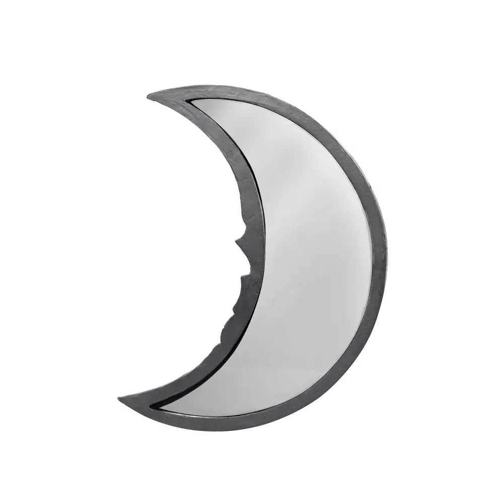 Productbeschrijving: Een spiegel in de vorm van een maan met gedetailleerde schedelafwerking. Handgemaakt van de beste kwaliteit zwarte hars.