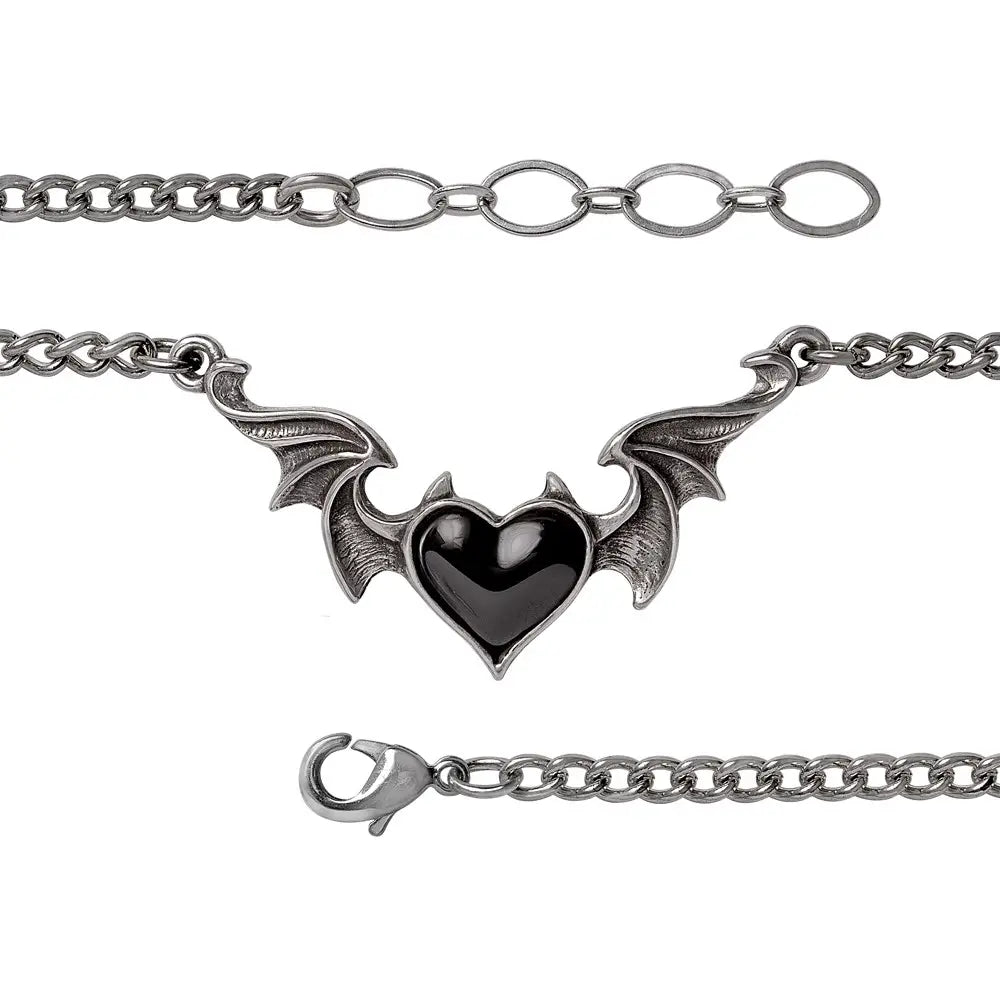Productbeschrijving: Een armband met een zwart gevleugeld hart en versierd met duivelshoorns. Compleet met een kettingversteller voor de perfecte pasvorm. Polsversiering als je durft! Perfect te combineren met P896, P934 (hangers) R240 (ring) E443, E444 (oorbellen).