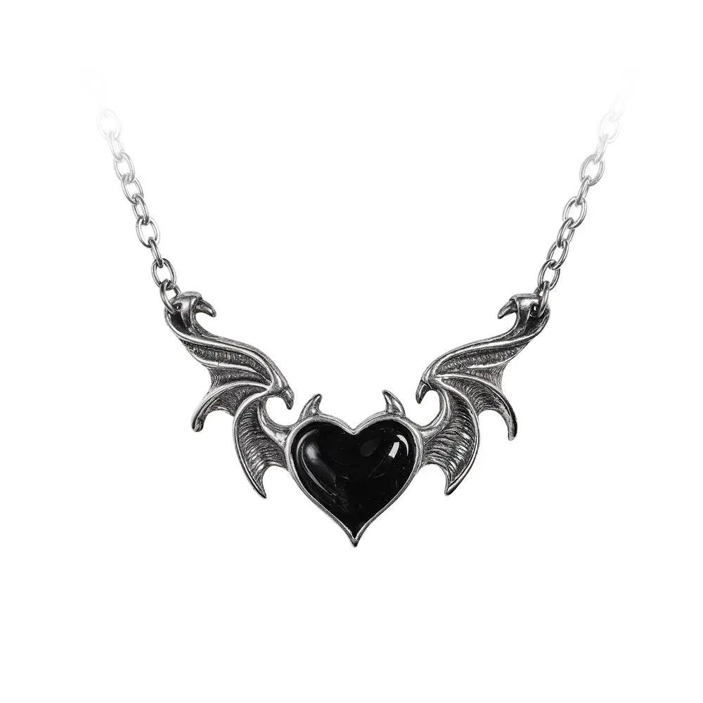 Productbeschrijving: Een geëmailleerd zwart hart met hoorns, tussen de uitgestrekte vliegende vleugels van een demon. Een ketting aan een gespleten traceketting van 20" (50 cm) in totaal plus een verlengketting van 1,5".