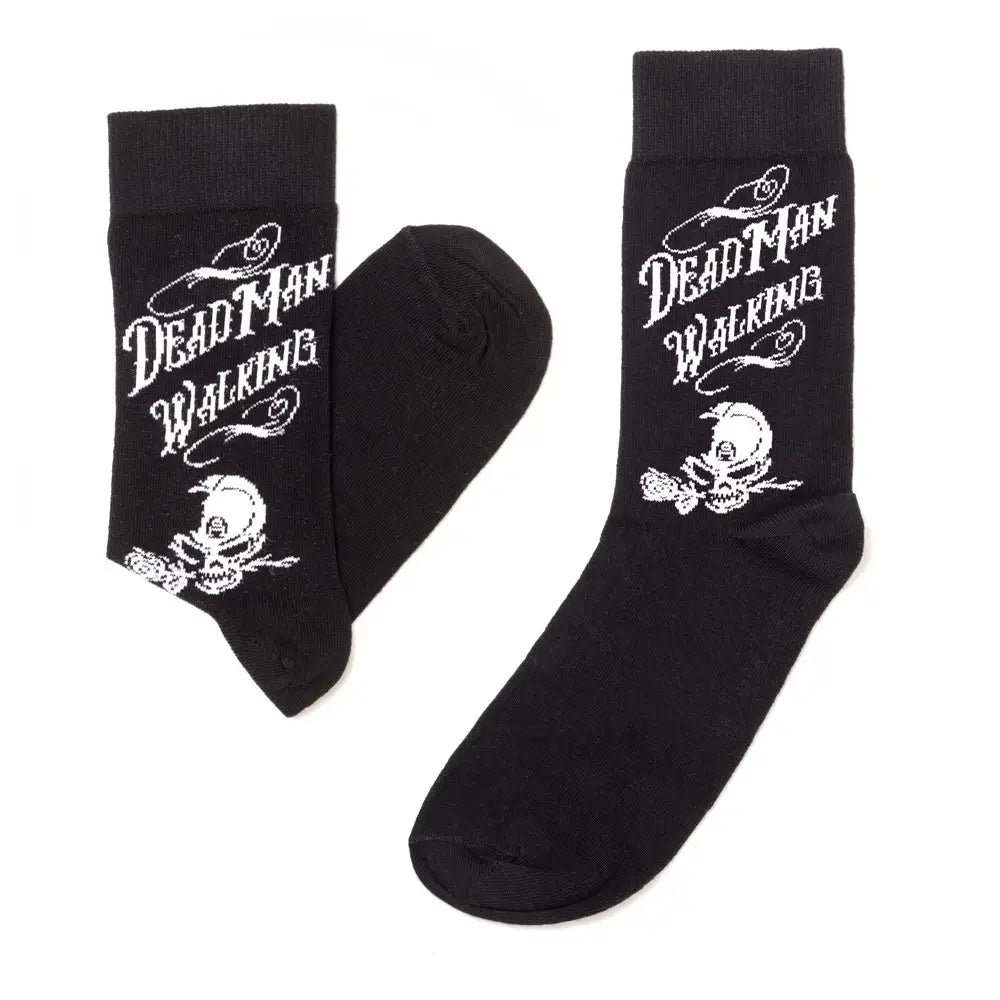 Leuke maar dodelijke sokken 'Dead Man Walking' - We hopen zeker dat je geen 'Deadman Walking' bent, maar misschien ken je iemand die dat wel is! Laat het hen weten met deze gezellige sokken met de donkere slogan en de iconische Alchemist schedel!