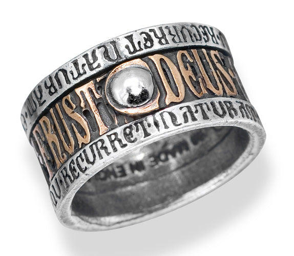 Deze Alchemy Gothic ring symboliseert de triomfantelijke harmonie van de Natuur en De Schepper. De massief bronzen centrale band leest "Deus Et Natura No Faciunt Frusta", wat is Latijn voor "God en de natuur werken niet tevergeefs samen." De inscriptie met tinnen rand voegt eraan toe: "De natuur zal altijd overwinnen."