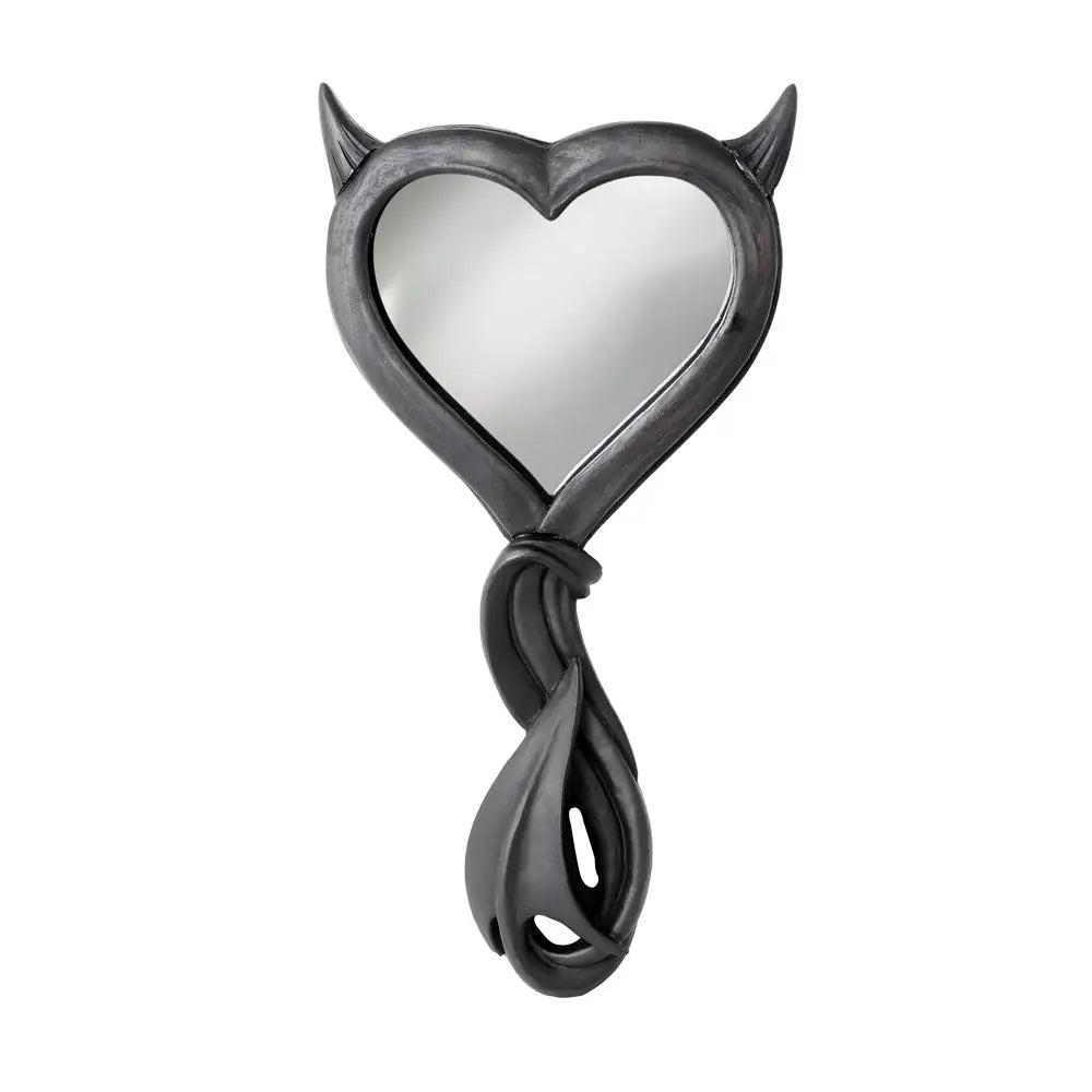 Productbeschrijving: Een duivels verbluffende handspiegel die er gewoon goddelijk uitziet in je boudoir. Hoogwaardige hars, met de hand afgewerkt in antiek zilver effect. Tweezijdige handspiegel waarvan één een vergrotende spiegel is voor close-up reflecties.