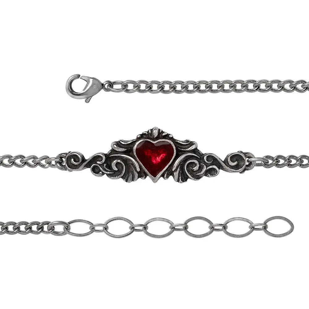 De zachte greep rond een fragiele pols wekt een amoureuze hartstocht op, met dit rococo meesterwerk van romantisch tokenisme en zijn bloedrode geëmailleerde hart van passie.