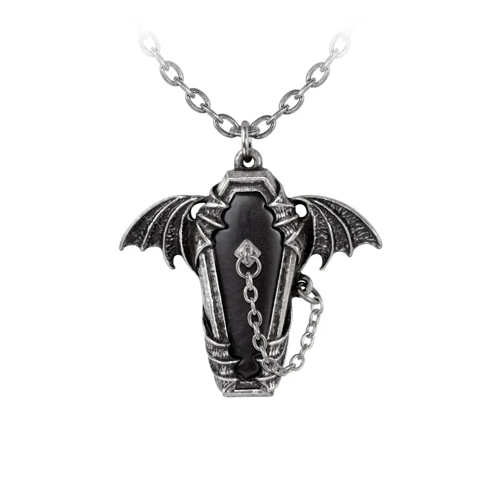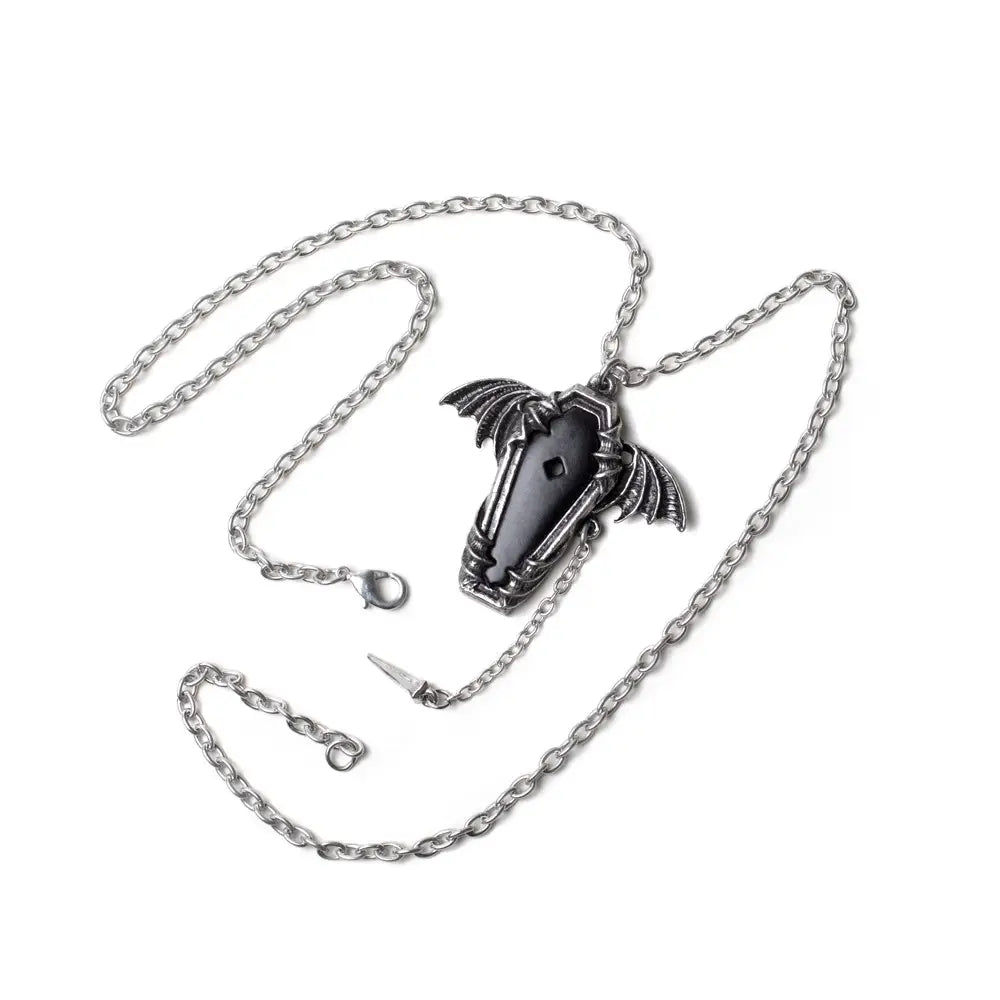 Productbeschrijving: Een gedetailleerde gevleugelde kist ingelegd met een zwartgeblakerde tinnen basis. Een spijker/stake hangt aan een ketting en kan in de kist worden gestoken - 'Spijker in de kist'.