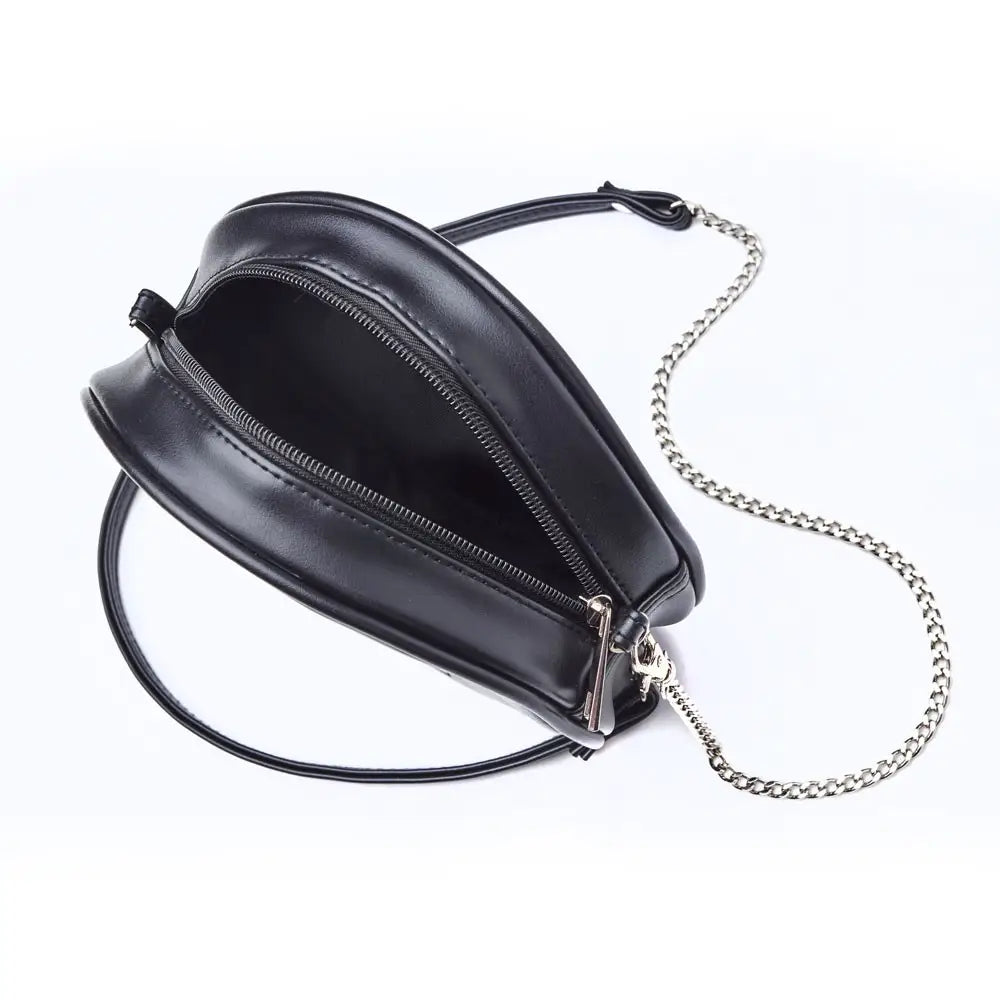 Een onweerstaanbare ronde, zwarte schoudertas met een opvallend alternatief, iconisch beeld dat gedurfd op de voorkant is gegraveerd om het alter ego van de drager te personifiëren.
