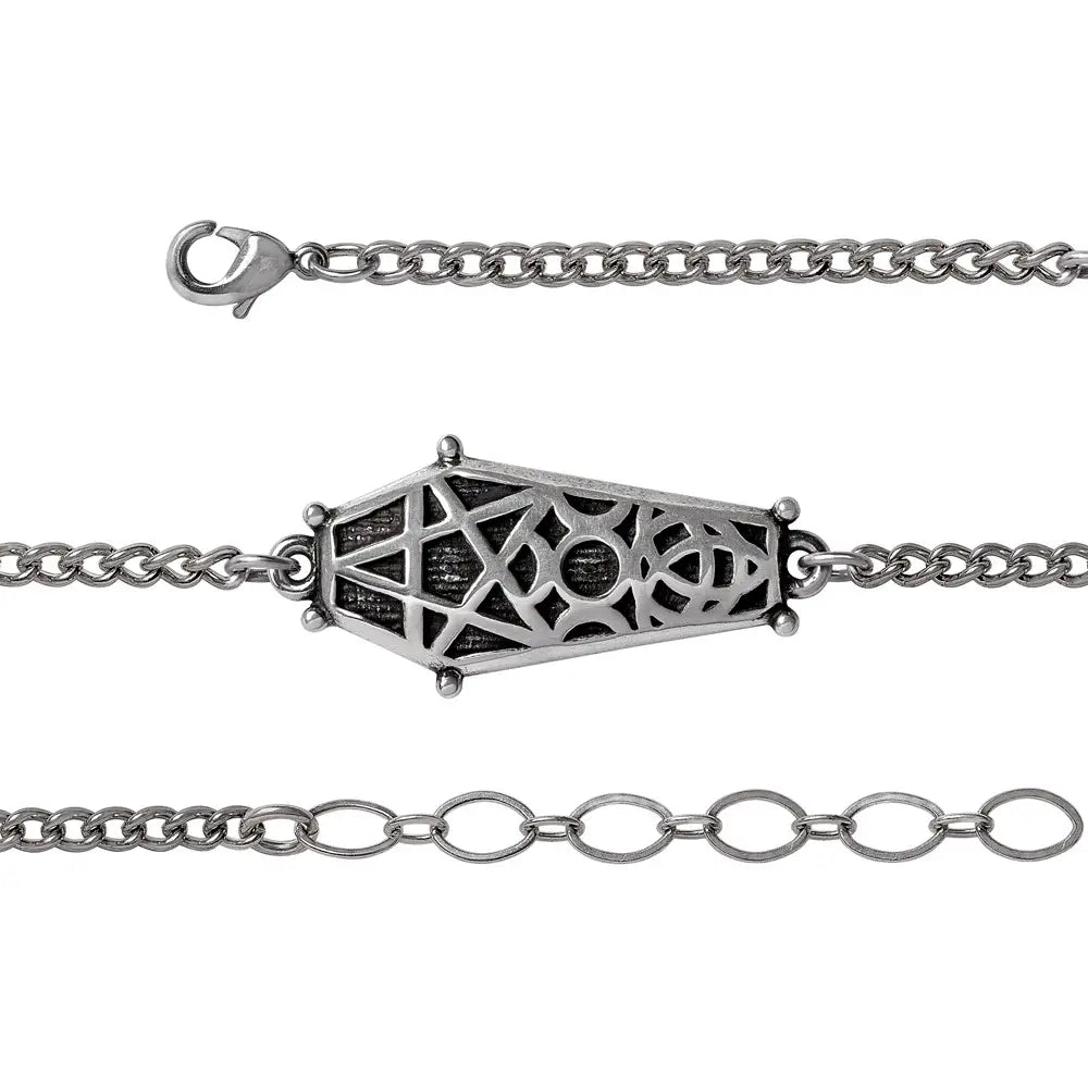 Productbeschrijving: Stap in een wereld waar duisternis elegantie ontmoet met onze verbluffende Hex Coffin Armband. Dit boeiende sieraad is ontworpen voor degenen die durven hun individualiteit te uiten. Gemaakt van verouderd tin, benadrukt de glinsterende afwerking prachtig de ingewikkelde details, waardoor het een onmisbaar accessoire is voor mystieke zielen en liefhebbers van het macabere. Omarm de symbolen van kracht en bescherming met de betoverende ontwerpen van de drievoudige maan en pentagram die in de door een doodskist geïnspireerde silhouet zijn geëtst.