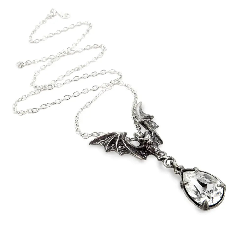 Productbeschrijving: Een tinnen hanger van een vliegende vleermuis met opgeheven vleugels, die een heldere traanvormige kristal in een tinnen klauwsetting vasthoudt.