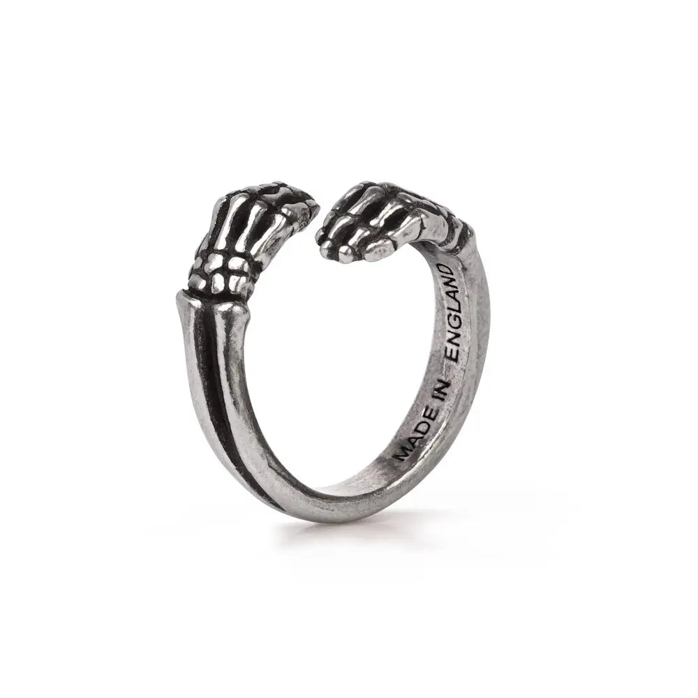 Een prachtige handgemaakte tinnen knuffel ring. Met miniatuur skeletachtige handen is deze ring het perfecte teken van liefde om aan een geliefde te schenken!