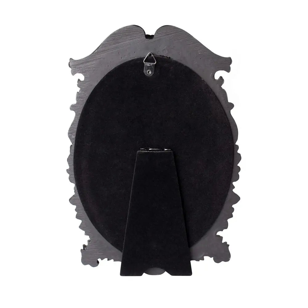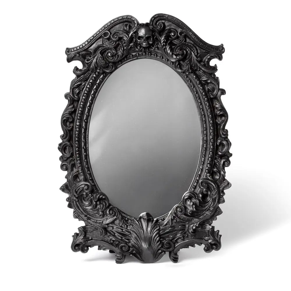 Productbeschrijving: Een gegoten harsen spiegel met standaard en wandmontage; met de hand geschilderd en afgewerkt.