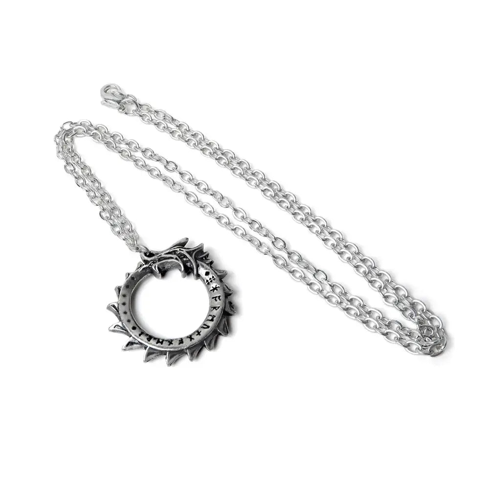 Een discreet talismanisch ouroboros, embleem van heelheid, gevormd door de legendarische Noorse Midgard-slang.
