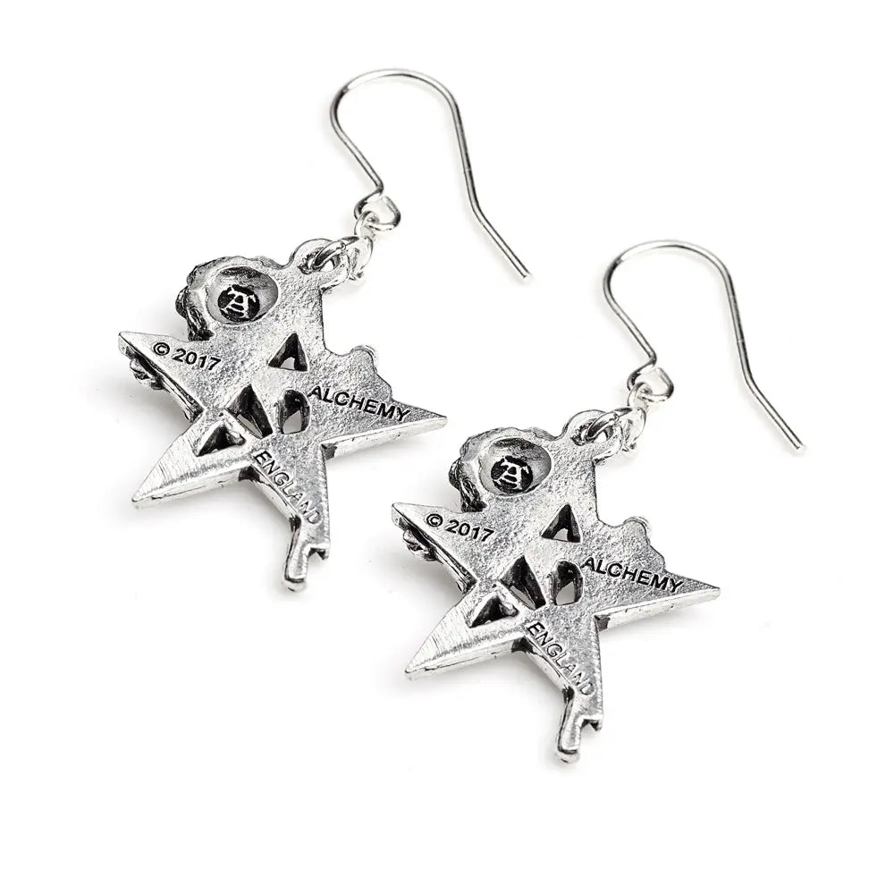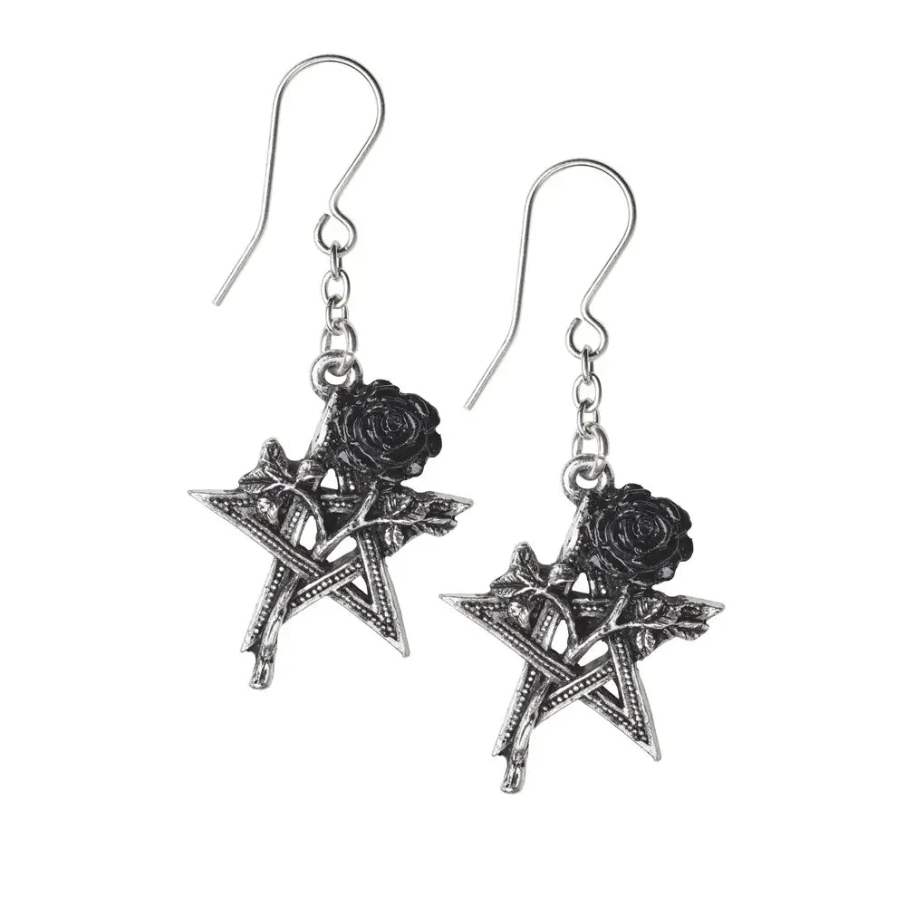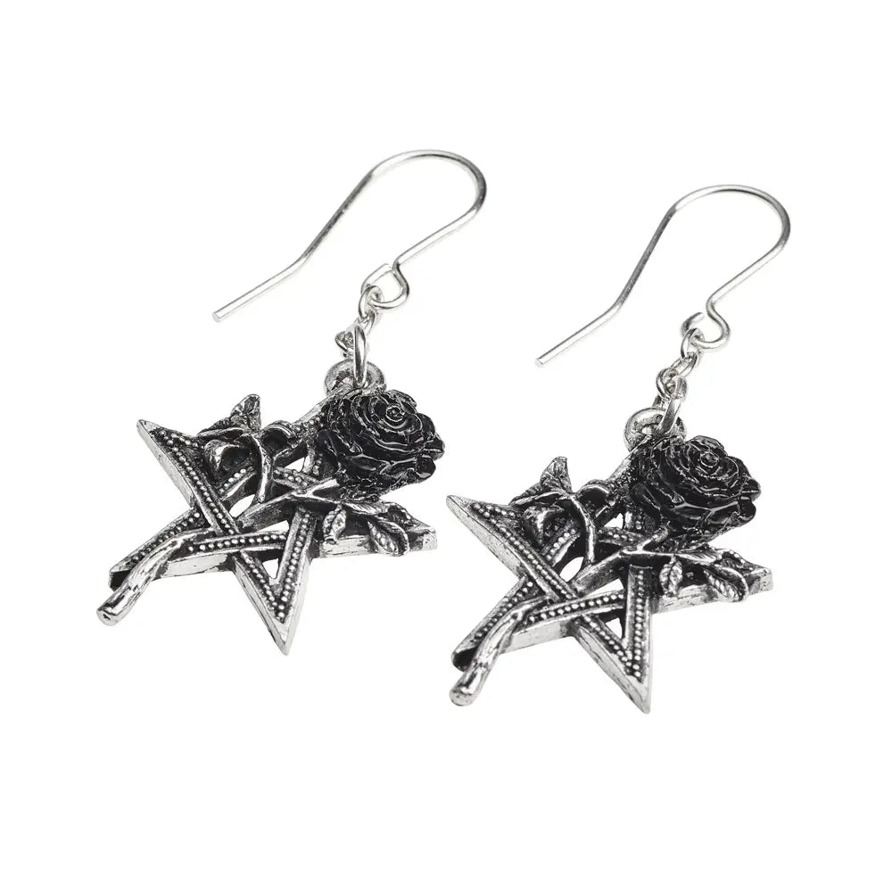 Productbeschrijving: Een paar gedetailleerde tinnen pentagrammen, elk verstrengeld met een roos met zwarte bloemblaadjes. Op chirurgisch stalen oorhaken aan een fijne ketting.