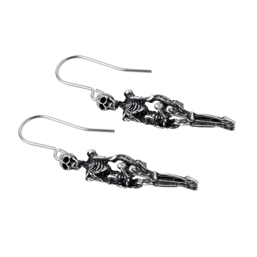 Productbeschrijving: Een paar miniatuur skelet, tinnen oorbellen aan chirurgisch stalen oorhaken.