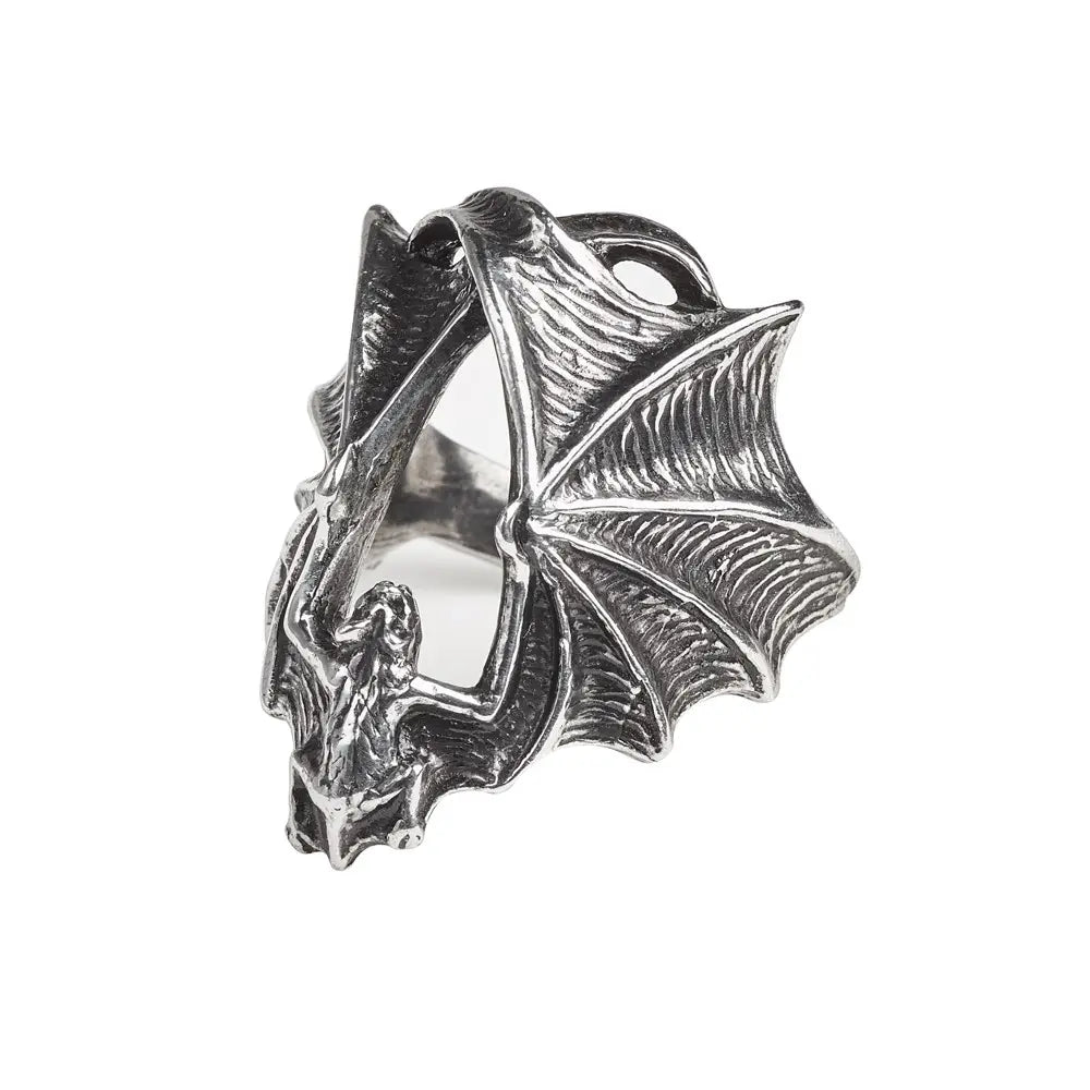 Productbeschrijving: Een grote, antieke tinnen ring in de vorm van een kruipende vleermuis, met enorme uitgestrekte vleugels die de vinger bedekken.