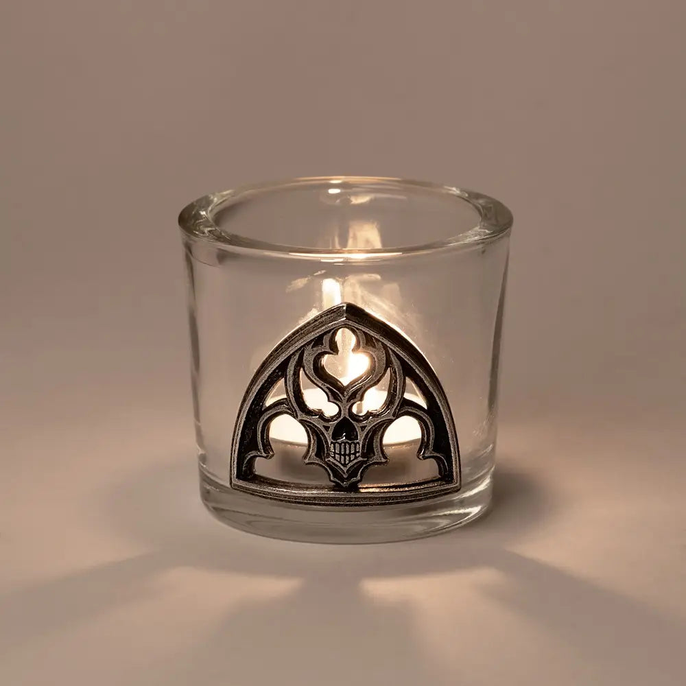 Productbeschrijving: Helder glazen t-light kaarshouder met tinnen badge met een origineel Alchemy-ontwerp.