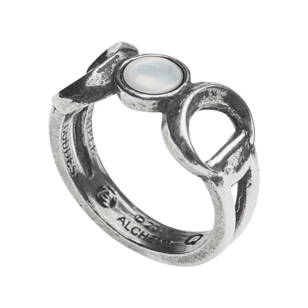 Productbeschrijving: Een delicate, antiek ogende tinnen drievoudige maanring, gezet met een centrale, parelmoeren cabochon volle maan, op een gespleten schacht.