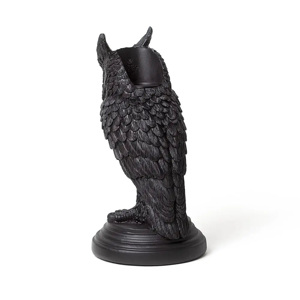 Productbeschrijving: Een prachtig gebeeldhouwde uilenkandelaar, met de hand afgewerkt in de beste kwaliteit zwarte hars. Een donkere en dramatische kandelaar om uw eettafel, boudoir of altaar te verfraaien.