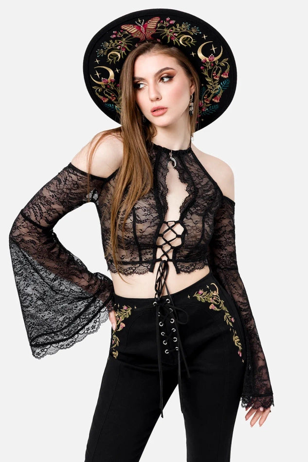 Beweeg als een mot door een geheime tuin. Deze heksenachtige wijde pijpen combineren retro flares met mystieke charme. Vervaardigd in zwart denim met mot & bloemen borduurwerk, combineren ze vintage inspiratie met moderne heksachtige stijl. Perfect als alledaagse botanische jeans of voor bosfestivals.