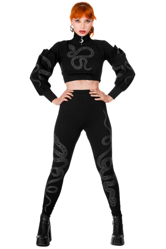 Leggings met slangenmotieven kunnen zowel met onze korte "Cathedral Snake"-blouse als met een getailleerde top worden gedragen, waardoor onconventionele outfits ontstaan.