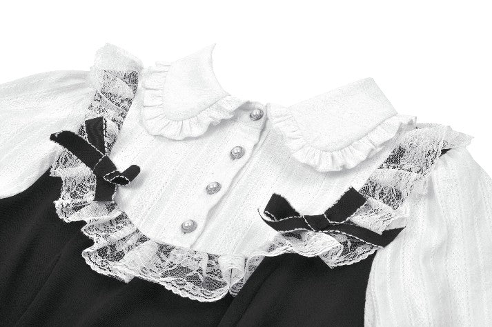 Delicaat zoet met een verfijnde rand, deze Lolita-jurk heeft een charmant vals tweedelig ontwerp gemaakt van gebroken witte stof met textuur en contrasterende zwarte keper. De vintage geïnspireerde Peter Pan-kraag is afgewerkt met kanten en strikaccenten, terwijl de echte voorste klep zowel stijl als functionaliteit toevoegt.
