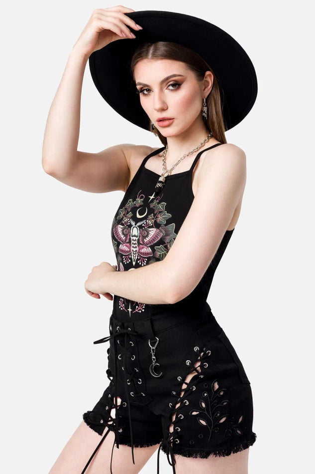 🌿 DAHLIA LACE-UP SHORTS – Witchy Denim Shorts met Bladuitsparingen & Vetersluiting ✨