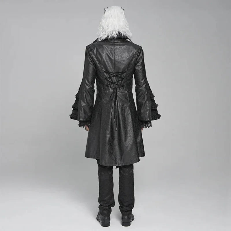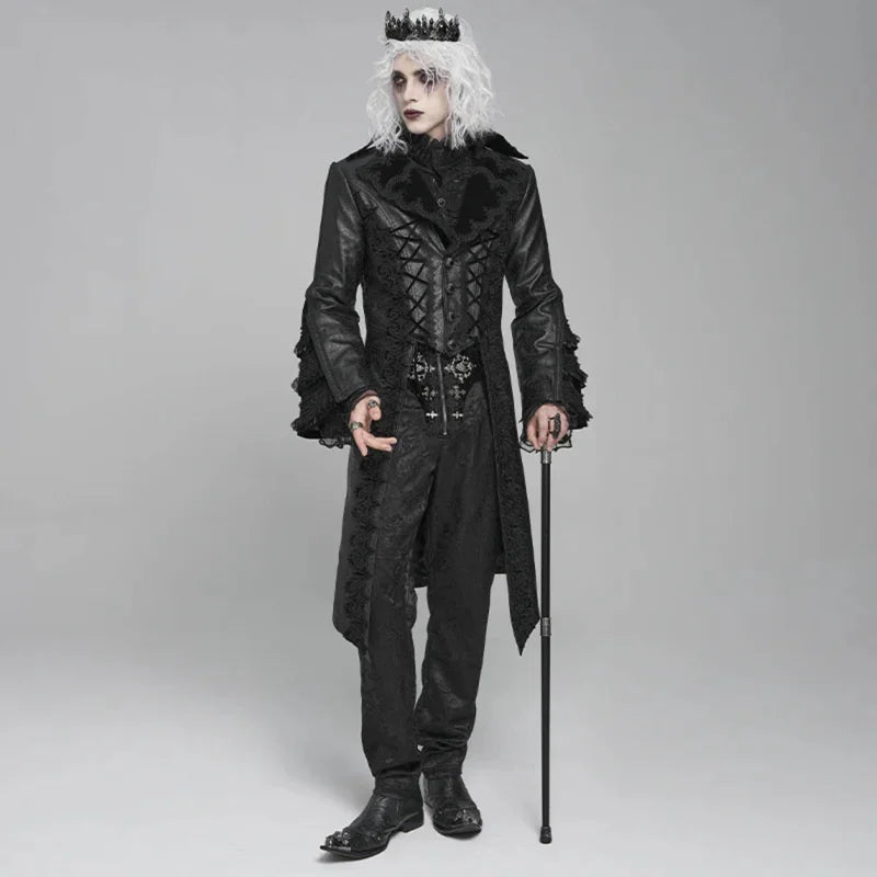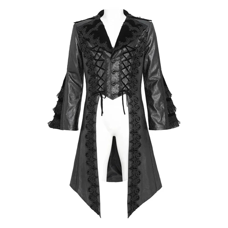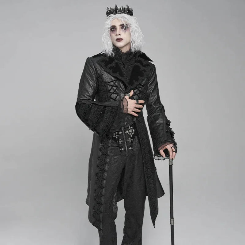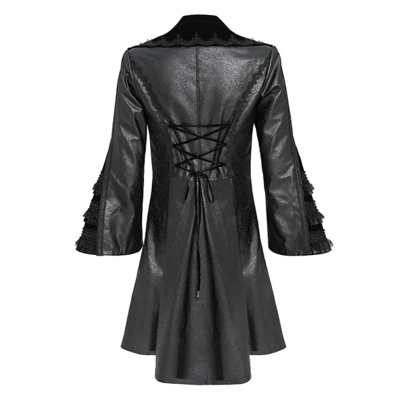 Deze mantel fluistert over oude eden, gefluisterd bij kaarslicht en verzegeld met bloed. "Bound by the Night" omhult je met Victoriaanse ernst, gotische strengheid en een vleugje troosteloosheid. Het kant op de mouwen trilt als de herinnering aan lang begraven beloften, terwijl het korset je adem inhoudt. Dramatische kraag, geperste nepleer en fluwelen ornamenten laten je eruitzien als een prins die door mist loopt. Voor degenen die niet bang zijn voor het donker - maar het leiden.