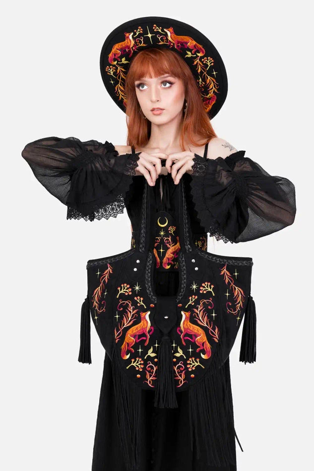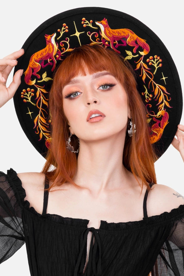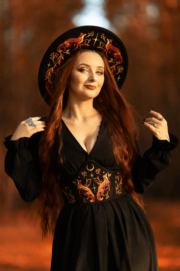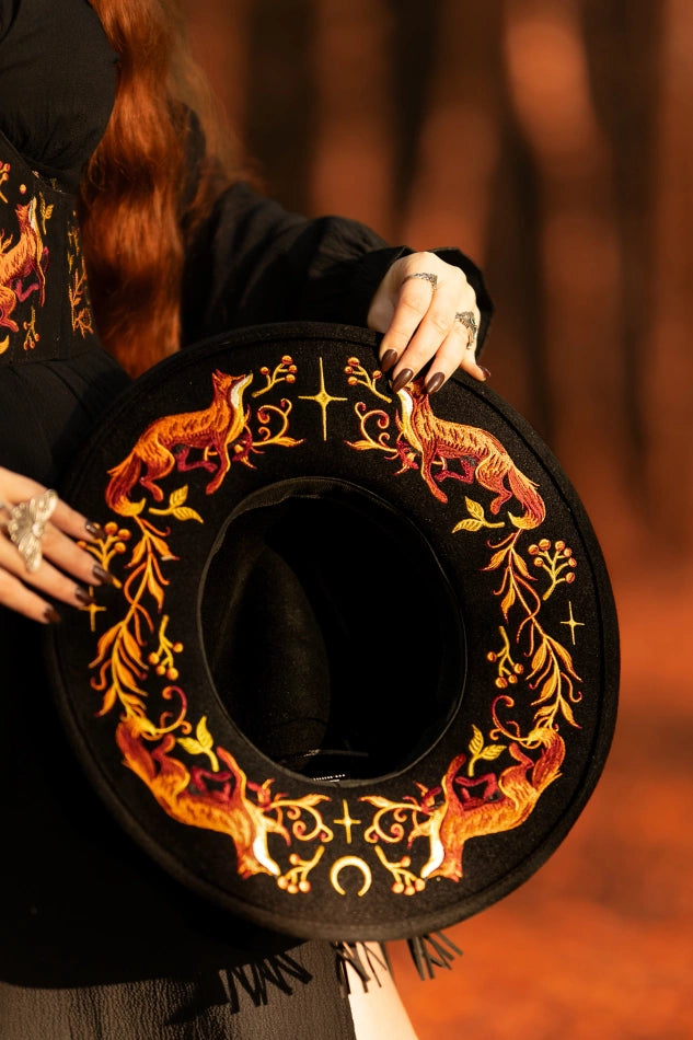 Een mystieke zwarte vossenhoed met een brede rand, versierd met vurige, ingewikkelde "Fireborne" borduursels – perfect voor liefhebbers van heksenstijl en gedurfde, elementaire looks. Het borduurwerk toont levendige vossen omringd door vlamachtige botanische motieven, die ongetemde energie mengen met donkere, magische elegantie.
