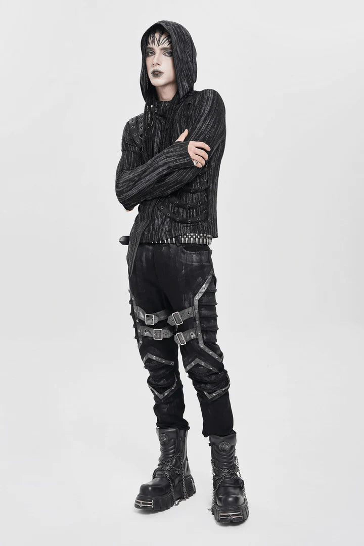 Stap de donkere kant van streetwear in met deze gotische punkbroek. Met versleten zwarte stof met ruige metallic accenten en meerdere gespbanden, combineren ze industriële rebellie en een gedurfde stijl. De gedetailleerde naden en nepleren panelen zorgen voor een gestructureerde, vechtklare esthetiek – perfect voor alternatieve, cyberpunk- en rockgeïnspireerde outfits.