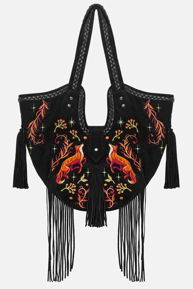 🦊🌾 FOX MEADOWS BAG - Oversized zwarte schoudertas van imitatiesuède met vosborduursel en franjedetails 🌙 Waar het wilde hart van de vos door schaduwrijke weiden zwerft.
