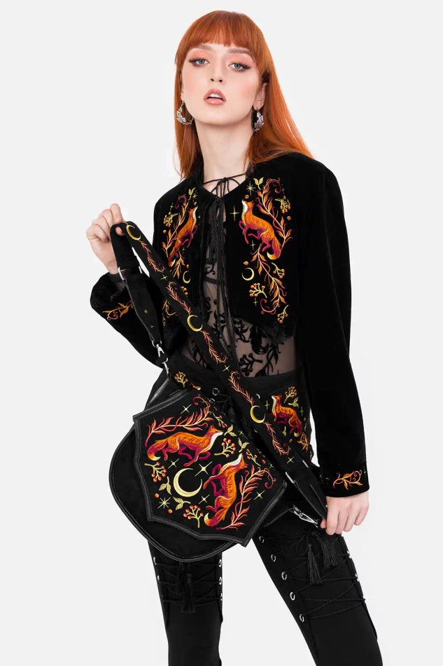 Een felle en betoverende fox bag voor liefhebbers van donkere eigenzinnigheid, heksenmode en forestcore-stijl. De zwarte tas van imitatiesuède is versierd met vurig rood vosborduurwerk, gloeiend als sintels in de nacht. Geïnspireerd door duistere sprookjes en bosmagie, combineert deze op de natuur geïnspireerde tas boho-mystiek met gotische elegantie, waardoor hij perfect is voor moderne heksen, wilde zielen en zwervers bij maanlicht. Een echte donkere vos die bekend is - gracieus, woest en klaar om je te volgen op elk betoverd bospad.