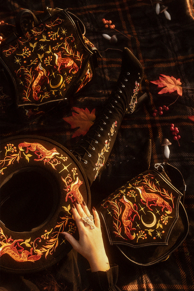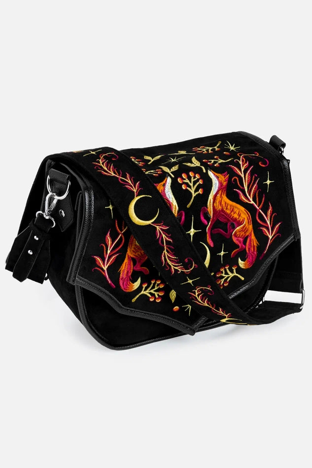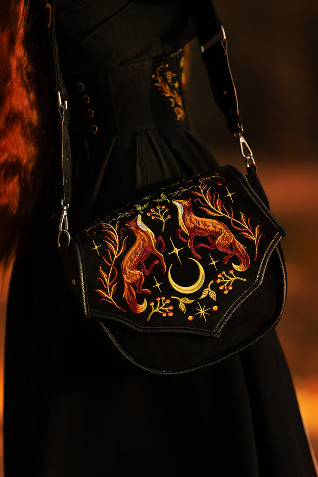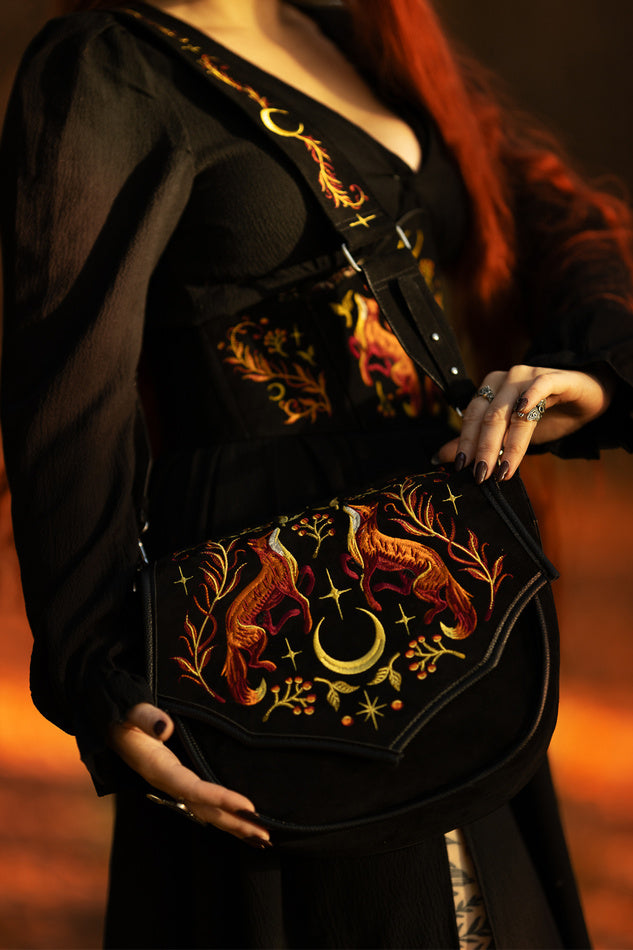 🔥 FOXFIRE NIGHTS BAG - Zwarte Faux Suede Schoudertas met Fox Borduurwerk & Dark Forest Details 🌙 Waar de sluwe geest van de vos en de donkere elegantie van het bos elkaar ontmoeten.