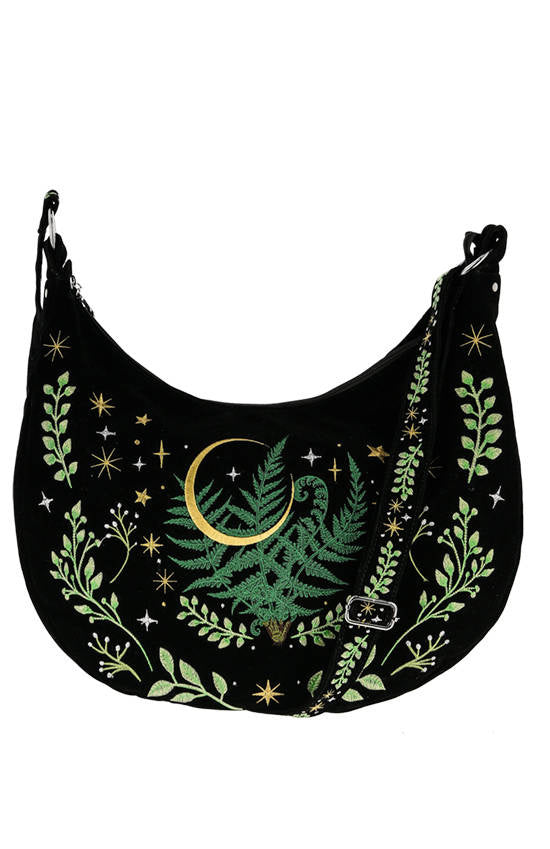 Deze hobotas met borduursel van varenbladeren, sterren en een gouden halve maan is een eerbetoon aan de vrouwelijke natuur. Het is mystiek en tegelijkertijd stijlvol en zeer ruim.