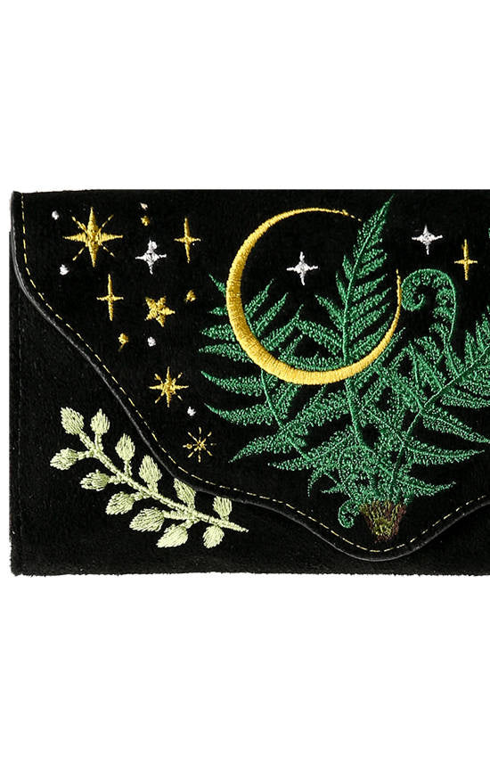 De portemonnee is langwerpig en gemaakt van kunstsuède, met een kunstleren binnenkant. Het is heel gemakkelijk en handig om te openen met een sterke sluiting. De voorkant is versierd met geborduurde bloemmotieven: kruiden, varens, twijgen. We zijn er absoluut zeker van dat elke druïde, wijze vrouw en kruidenpriesteres erg trots zou zijn op zo'n portemonnee!