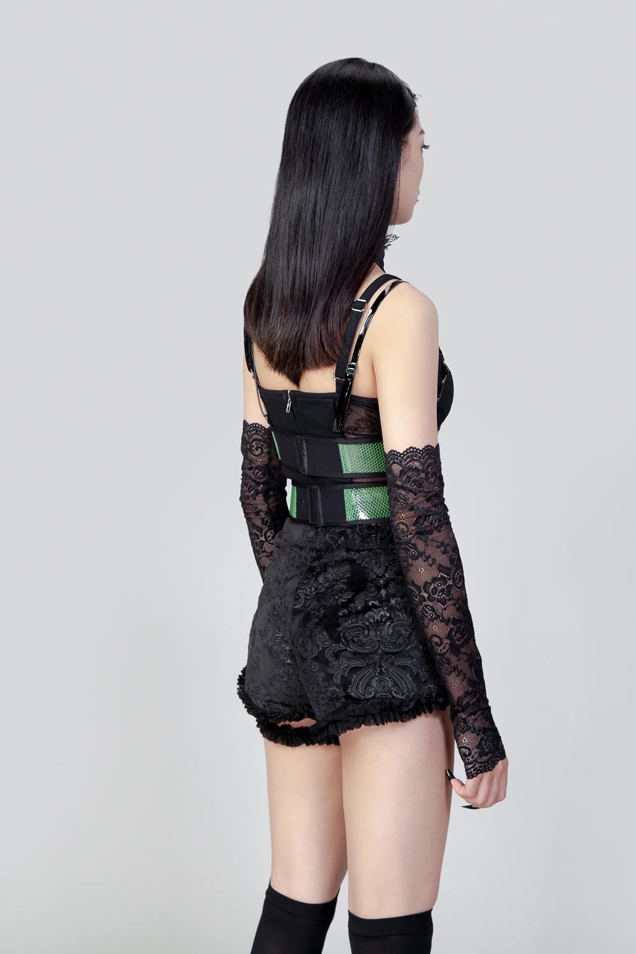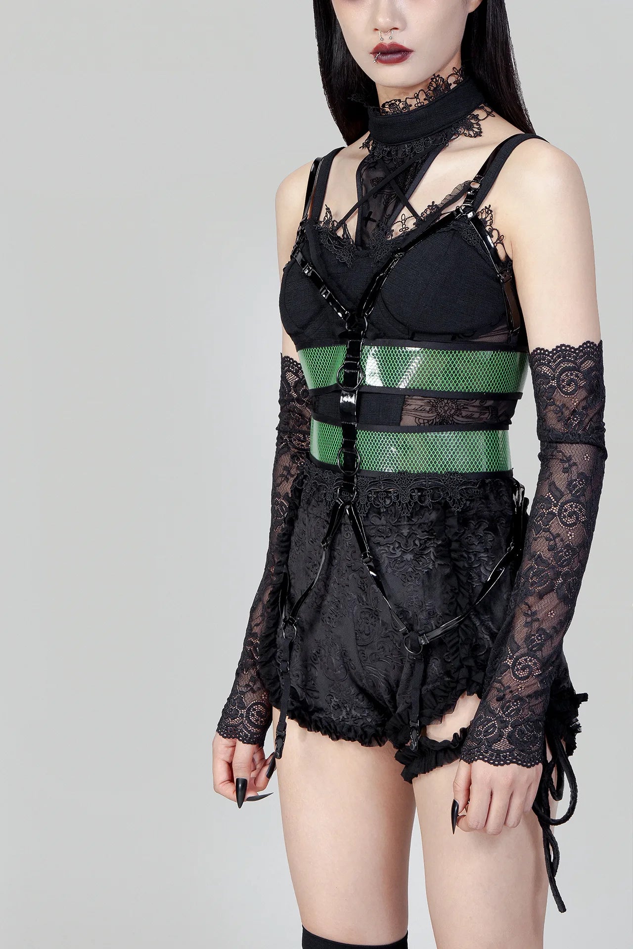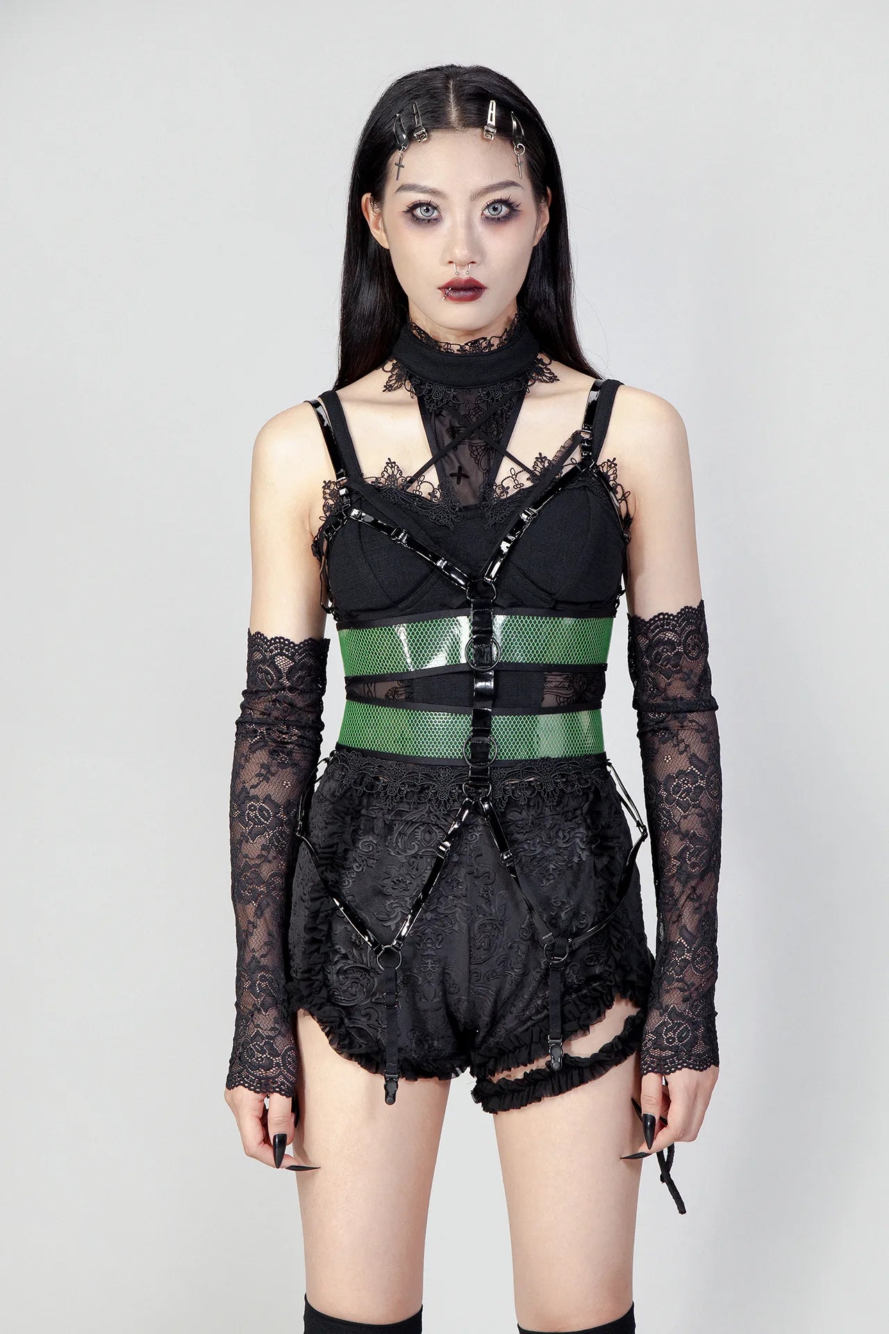 Tilt je alternatieve garderobe naar een hoger niveau met dit opvallende nu goth harnasje, ontworpen voor zowel visuele impact als draagbaarheid. De dubbele mesh tailleband heeft stevige haak-en-oogsluitingen aan de achterkant, wat zorgt voor een aanpasbare pasvorm die zich aanpast aan jouw silhouet. Gemaakt van een duurzame EVA- en nylonmix met PU-accenten, combineert dit stuk structurele integriteit met de verfijnde esthetiek die de hedendaagse gotische mode kenmerkt. Een essentieel laagjesstuk voor wie verfijning wil in hun statementkleding.