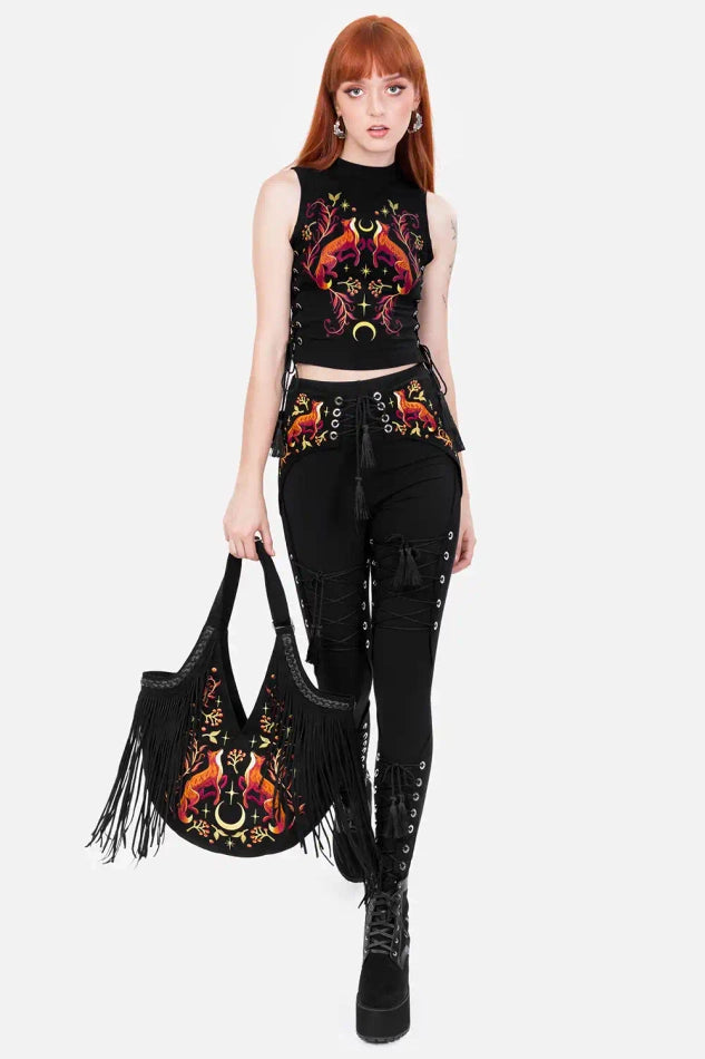 Een heksenachtige vossenzak gloeiend van sinteltonen, geboren uit de ontmoeting van maanlicht, vuur en bosschaduwen. Deze schoudertas met vosborduursel is geïnspireerd op donkere sprookjes en betovering van het bos. Gemaakt voor degenen die een beetje maanlicht in hun hart dragen.