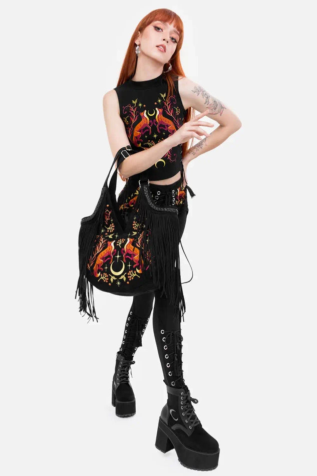 🦊🌕 LUNAR GROVE BAG - Grote zwarte schoudertas van imitatiesuède met vosborduursel en franjedetails 🌿 Waar het maanlicht de vlam van de vos ontmoet.