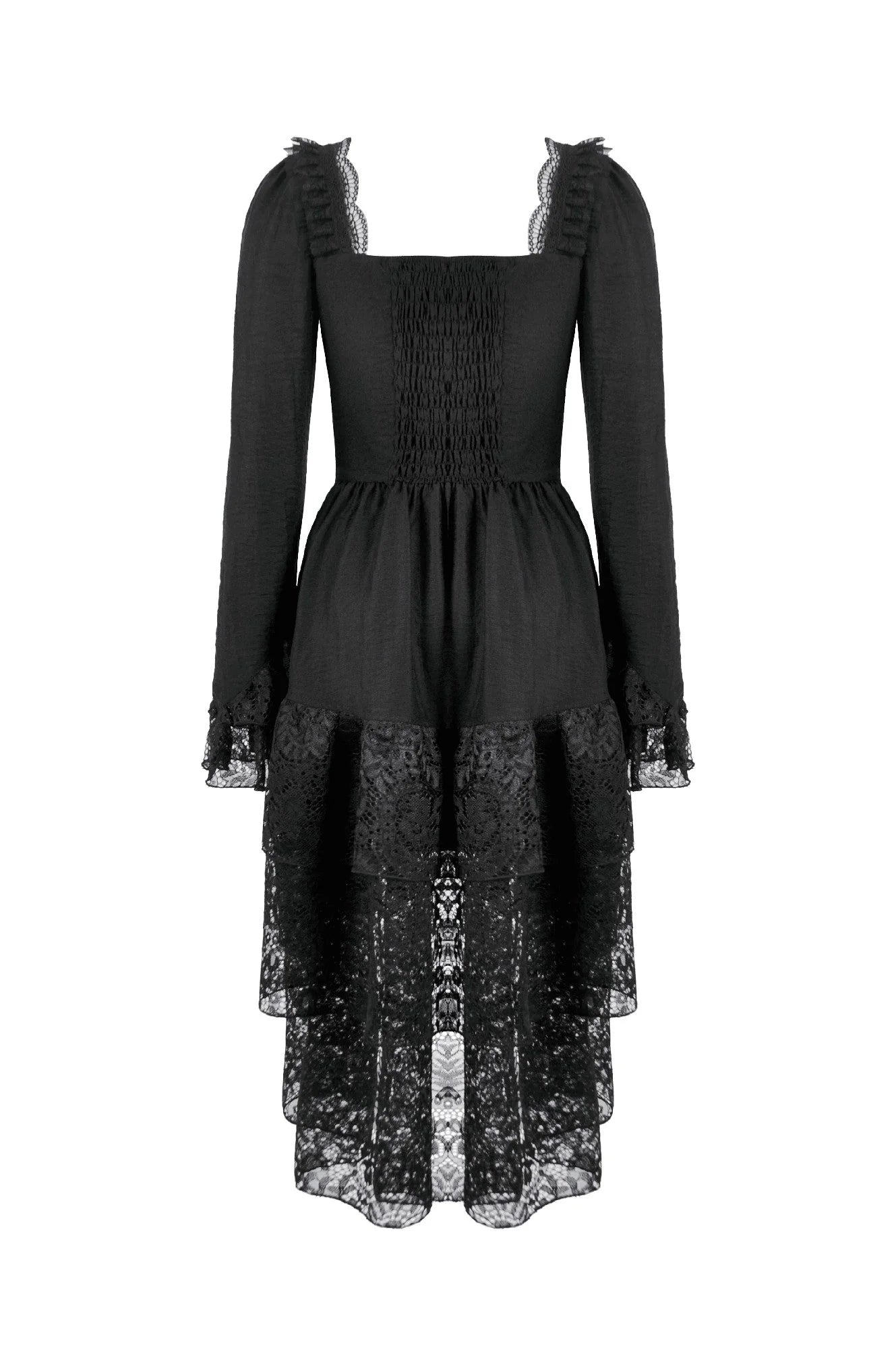 Deze romantische gotische kanten jurk is versierd met prachtig borduurwerk en fijne kanten biezen, wat zorgt voor een verfijnde en elegante uitstraling. De zoom vloeit naar beneden in zachte kanten rondingen, wat een sierlijk gelaagd effect toevoegt. De manchetten zijn voorzien van dubbele kant met decoratieve randen voor extra detail.
