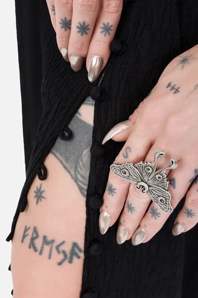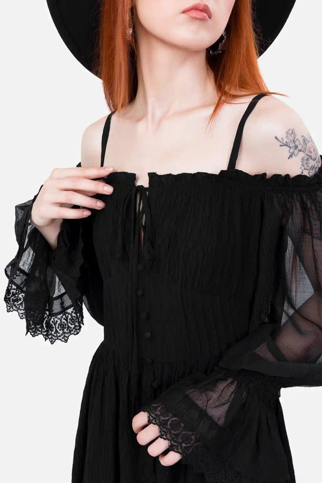 Een vloeiende gotische maxijurk geweven met de essentie van donkere romantiek en heksachtige elegantie. De zweverige, etherische silhouet roept het mysterie op van middernachtelijke bijeenkomsten en bosrituelen. Perfect voor wie houdt van trad goth, speelse en gothic boho-stijlen, deze zwarte fantasiejurk valt prachtig en past moeiteloos bij korsetriemen of gelaagde sieraden voor een betoverende look.