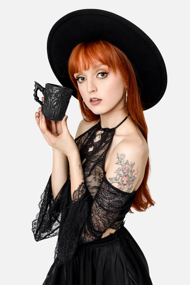 Perfect voor het brouwen van je heksenkoffie, thee of drankje terwijl de nachten langer worden. Deze kathedraalmok is een mystieke toevoeging aan elke gotische wooncollectie. Het aangepaste ontwerp is voorzien van ingewikkelde maaswerkmotieven van de kathedraal en het handvat is geïnspireerd op een vleermuisvleugel.