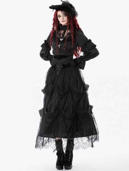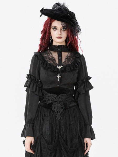 Deze elegante zwarte blouse heeft dramatische ruchedetails en fijne kanten accenten, wat zorgt voor een opvallende gotische uitstraling. Ontworpen met een hoge halslijn en een knoop aan de voorkant, biedt het zowel verfijning als stijl.