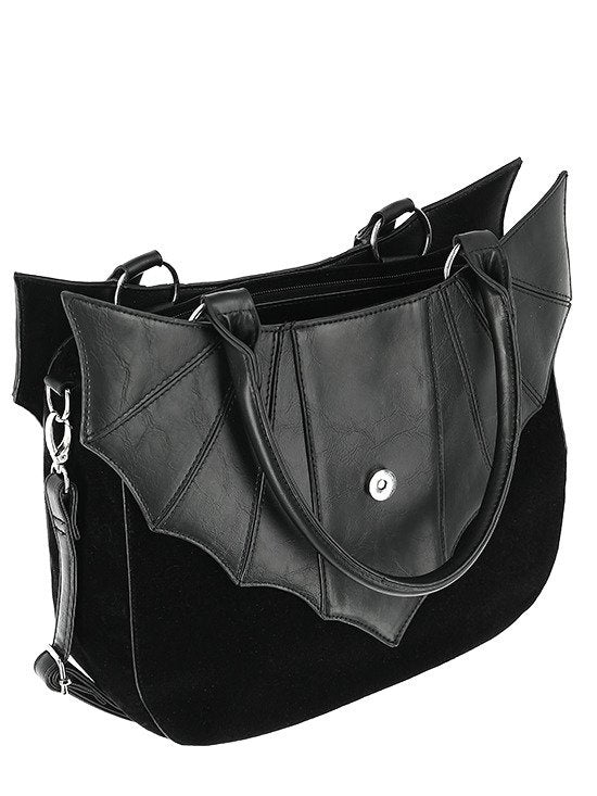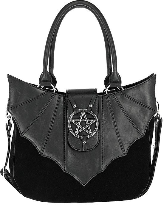 Elegante gothic handtas met pentagram en vleermuisvleugels. Gemaakt van stevig fluweel en de vleugels zijn van nepleer. De vleugels worden aan de zijkanten met elkaar verbonden om de tas te sluiten. Daarboven zit nog een riempje met een pentagram om de tas helemaal af te sluiten. Vanbinnen is de tas gevoerd met een vak met rits.